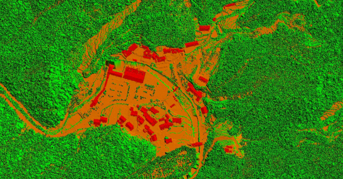 點(diǎn)云分類后的地面點(diǎn)(棕色)、建筑物點(diǎn)(紅色)、植被點(diǎn)(綠色)