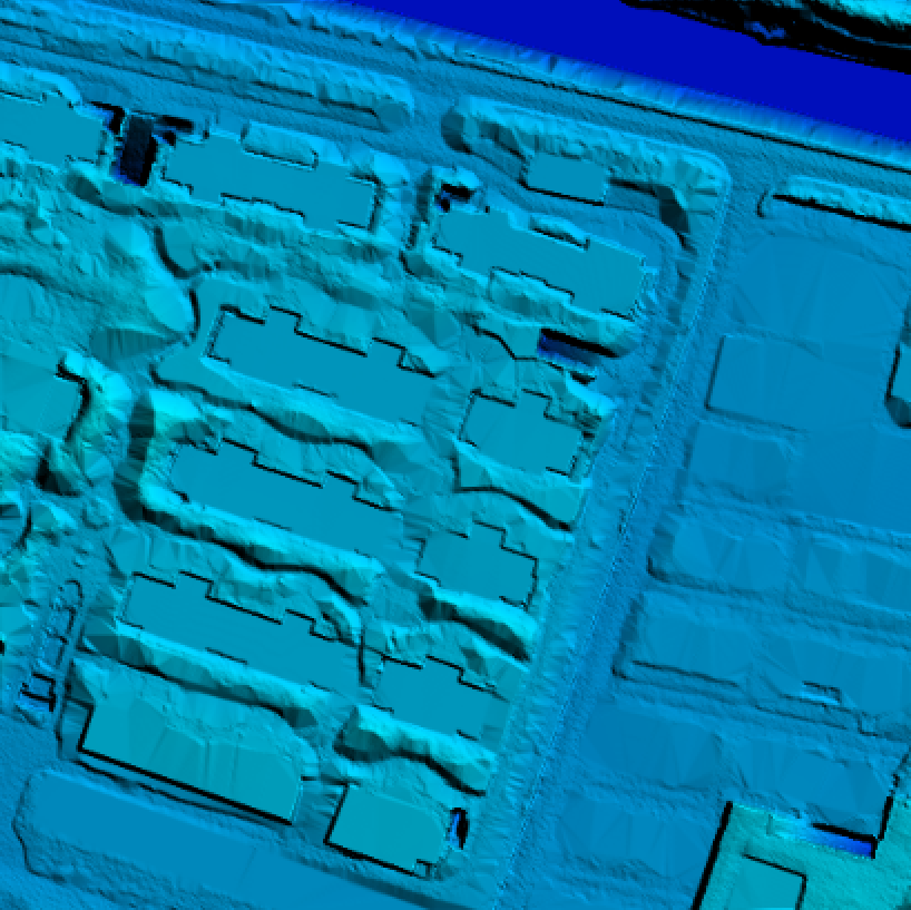 以分類點(diǎn)云中所有地表點(diǎn)以及地表之上的植被、建筑物、構(gòu)筑物等自然及人工地物表面形態(tài)上的點(diǎn)均作為特征點(diǎn),并以帶有高程信息的面狀水域范圍線作為特征線,構(gòu)建并輸出數(shù)字表面模型(DSM)產(chǎn)品。