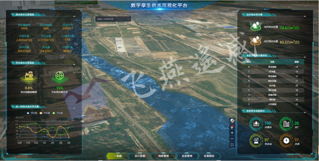 數字孿生供水平臺,集成數字孿生技術、三維可視化技術,通過建模渲染建立水務設施的結構形狀和位置關系,實現物理對象的數字化表達。打通水務管理中各業務系統的數據孤島,實現水務工程的三維展示、全過程實時監測、故障預警等,協助管理者一目了然地掌握業務趨勢,獲取數據使用價值,完成高效率管理、運營和決策。