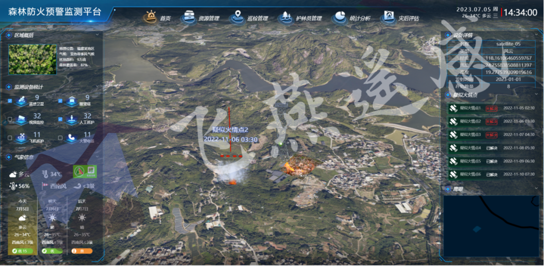 以飛燕Swift 4D為底座,利用應用遙感技術、GIS技術、三維技術、大數據技術、人工智能等技術,融合林區實景三維數據、地理信息數據,監測數據,森林資源、林業設施設備、林業物資庫、巡護管護人員等多源數據,構建林業監測一張網、森火全周期管理等能力,有效提升林區主管部門對火情監測預警、應急調度等科學決策能力水平。