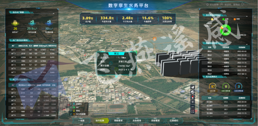 集成數字孿生技術、三維可視化技術,通過建模渲染建立水務設施的結構形狀和位置關系,實現物理對象的數字化表達。打通水務管理中各業務系統的數據孤島,實現水務工程的三維展示、全過程實時監測、故障預警等,協助管理者一目了然地掌握業務趨勢,獲取數據使用價值,完成高效率管理、運營和決策。