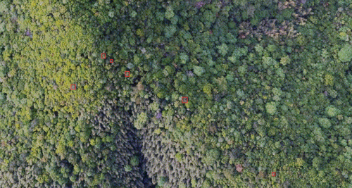 3.成果導出,AI松材線蟲病識別完成后生成帶標識成果圖和疑似疫木坐標表。