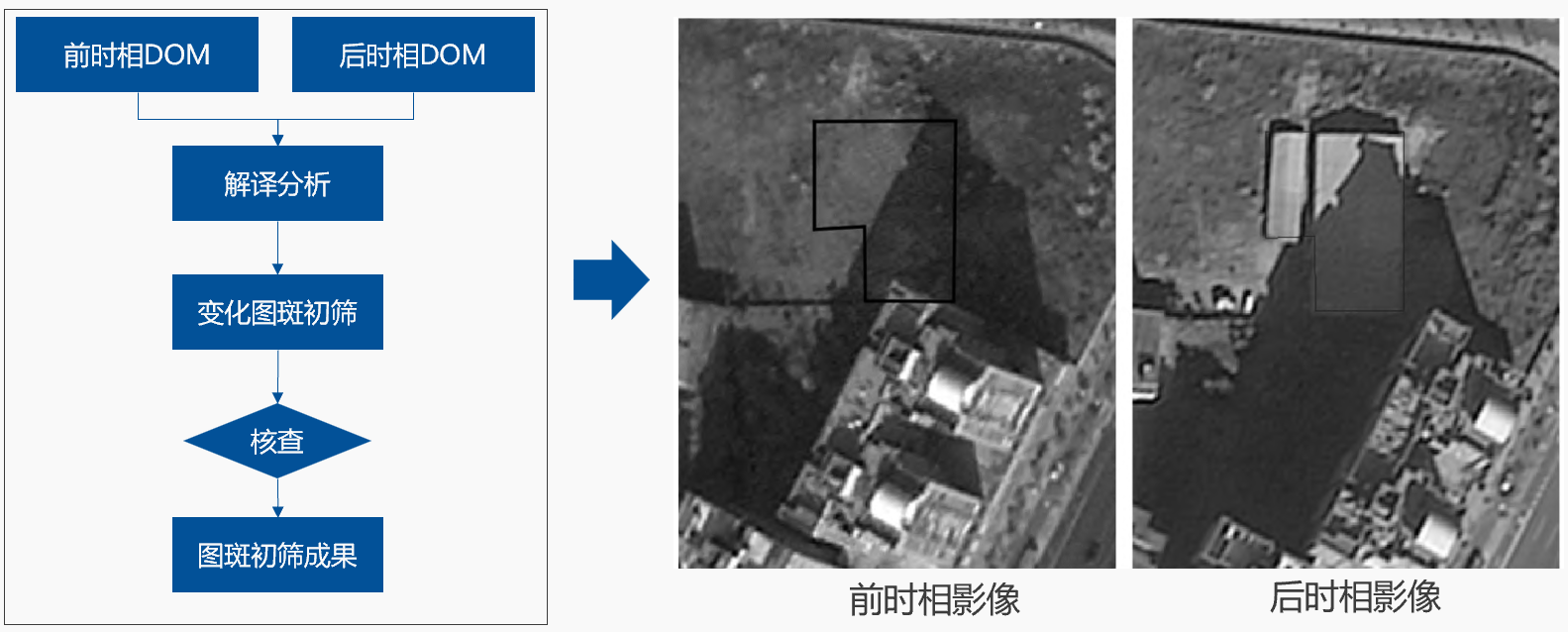 基于智能解譯中心平臺,利用多期數字正射影像數據進行變化監測處理,檢測變化建設用地或違法建筑圖斑。逐塊逐片比對影像紋理,判讀變化圖斑,并逐一圈定疑似變化圖斑。