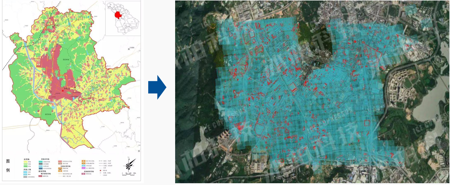 根據自然資源部門提供的土地利用現狀 、 永久基本農田現狀 、 耕地現狀等土地規劃數據,通過時空大數據平臺進行圖斑判讀 、 分析和篩選 , 形成疑似 “ 兩違 ” 圖斑。