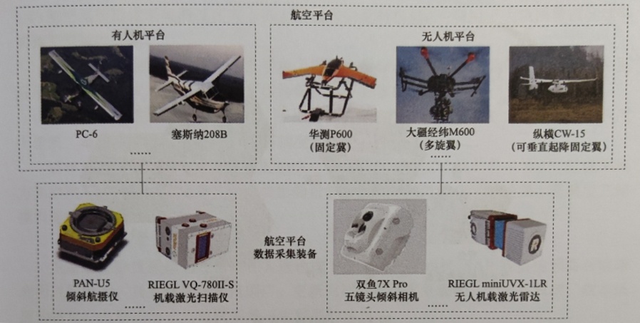 航空遙感平臺主要包括大型有人機和小型無人機平臺,并根據數據需求的不同搭載多類型的采集設備。其中,大型有人機主要用于大范圍區域數據采集,小型無人機主要用于小區域和飛行困難區域數據采集,或作為有人機數據采集的補充,兩者各有優劣。地面平臺主要通過車載、背包、手持等方式,集激光雷達、光學相機、定姿定位系統等于一體,利用移動測量技術,獲取建筑、交通、地下管線等對象的高精度實景三維數據。