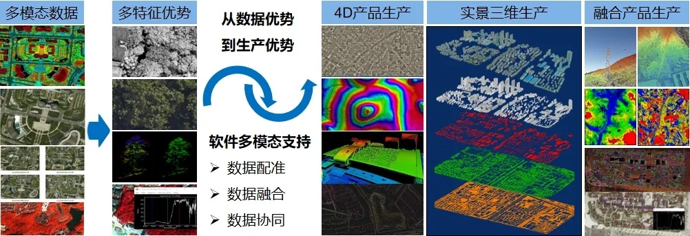 支持多源高分辨率影像聯合處理,通過對影像進行空三、密集匹配、構網、紋理映射,輸出Mesh實景三維模型,結合激光點云數據,生成DSM、DEM、DOM、DLG等數據產品,豐富成果類型。