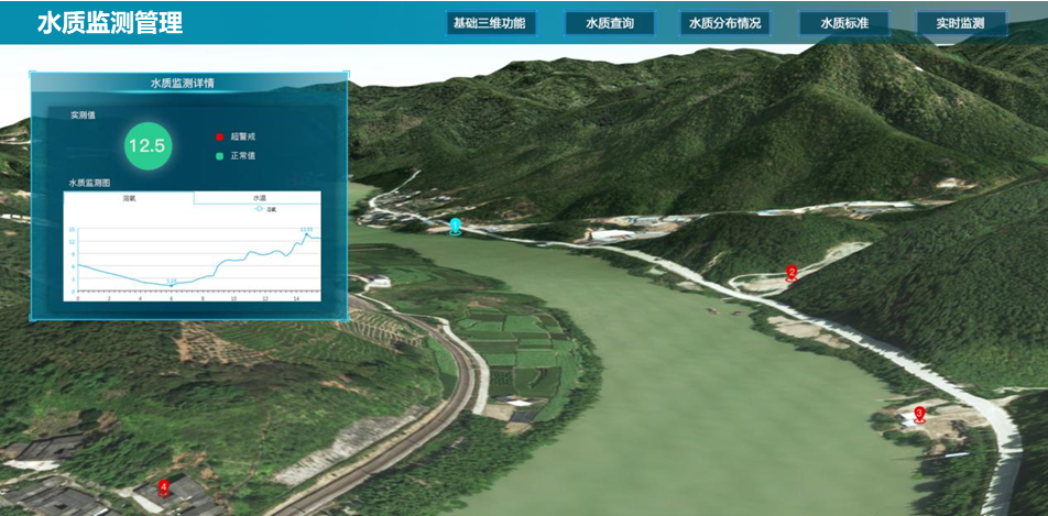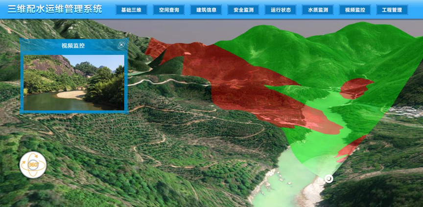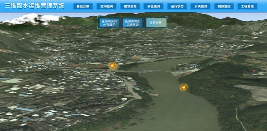 在系統(tǒng)中引入BIM模型,通過三維引擎仿真渲染后,實(shí)時(shí)直觀地以三維場景展示配水運(yùn)維工程,并將實(shí)時(shí)獲取的各類運(yùn)行信息在三維場景中結(jié)合局部三維模型直觀展示,具有配水運(yùn)維工程空間查詢、建筑信息查詢、安全監(jiān)測、運(yùn)行狀態(tài)監(jiān)測、水質(zhì)監(jiān)測、視頻監(jiān)控和工程管理等功能。