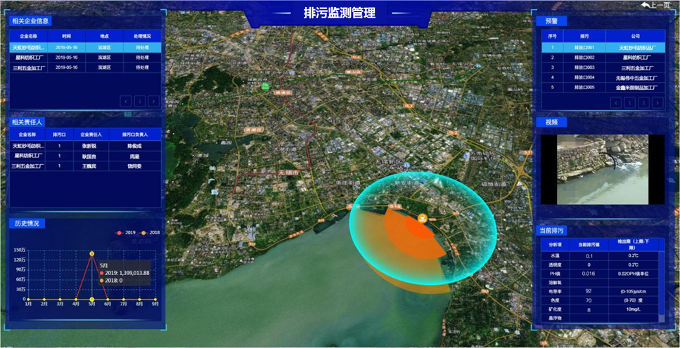 結(jié)合物聯(lián)網(wǎng)、網(wǎng)絡(luò)通信、傳感控制等信息科技手段,對各路管網(wǎng)污水排放、運(yùn)行、處理等進(jìn)行全程動態(tài)管控,統(tǒng)計(jì)排污總量、排污口等信息,并展示各區(qū)域內(nèi)排污治理情況。通過對污染源、管網(wǎng)、泵站、處理廠的水質(zhì)水量進(jìn)行監(jiān)控,實(shí)現(xiàn)排污預(yù)警預(yù)報(bào)功能。