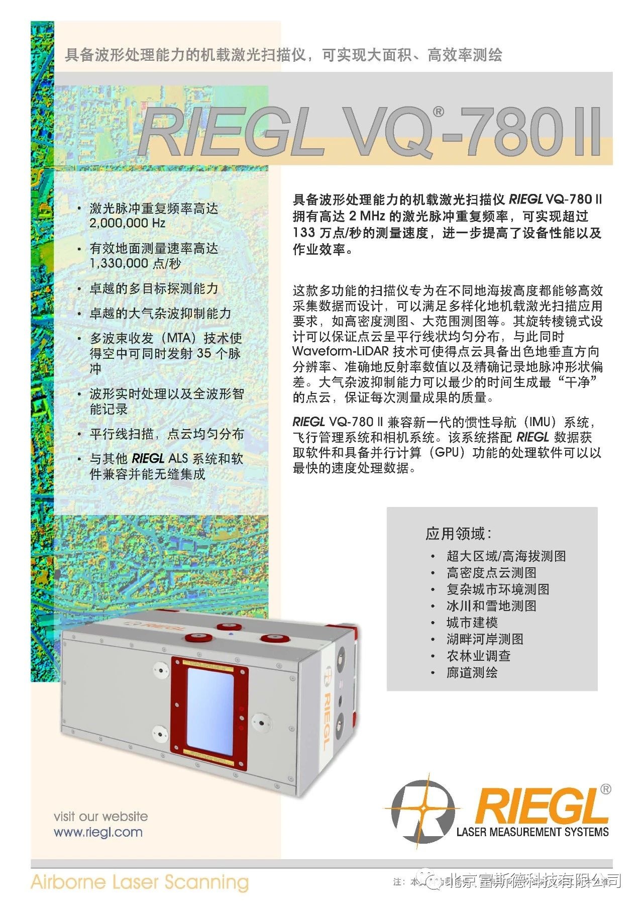 此次RIEGL VQ-780II會進(jìn)一步拓寬飛燕遙感在機(jī)載LiDAR遙感測繪領(lǐng)域的應(yīng)用,將更高效、更高質(zhì)量的硬件設(shè)備推向國內(nèi),為各企業(yè)、科研單位創(chuàng)建高水平技術(shù)發(fā)展平臺。